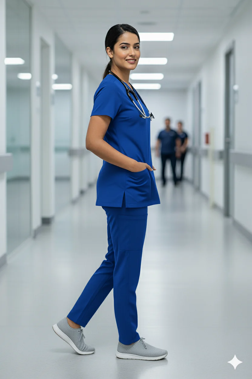 Classic Women’s V-Neck Scrubs are made from premium polyester viscose fabric (75% polyester, 25% viscose) for all-day comfort and breathability. Designed for women, these lightweight scrubs feature a classic V-neck. Antibacterial and bio-wash treatment ensures hygiene and softness, while durable stitching provides long-lasting wear—perfect for doctors, nurses, and medical students.